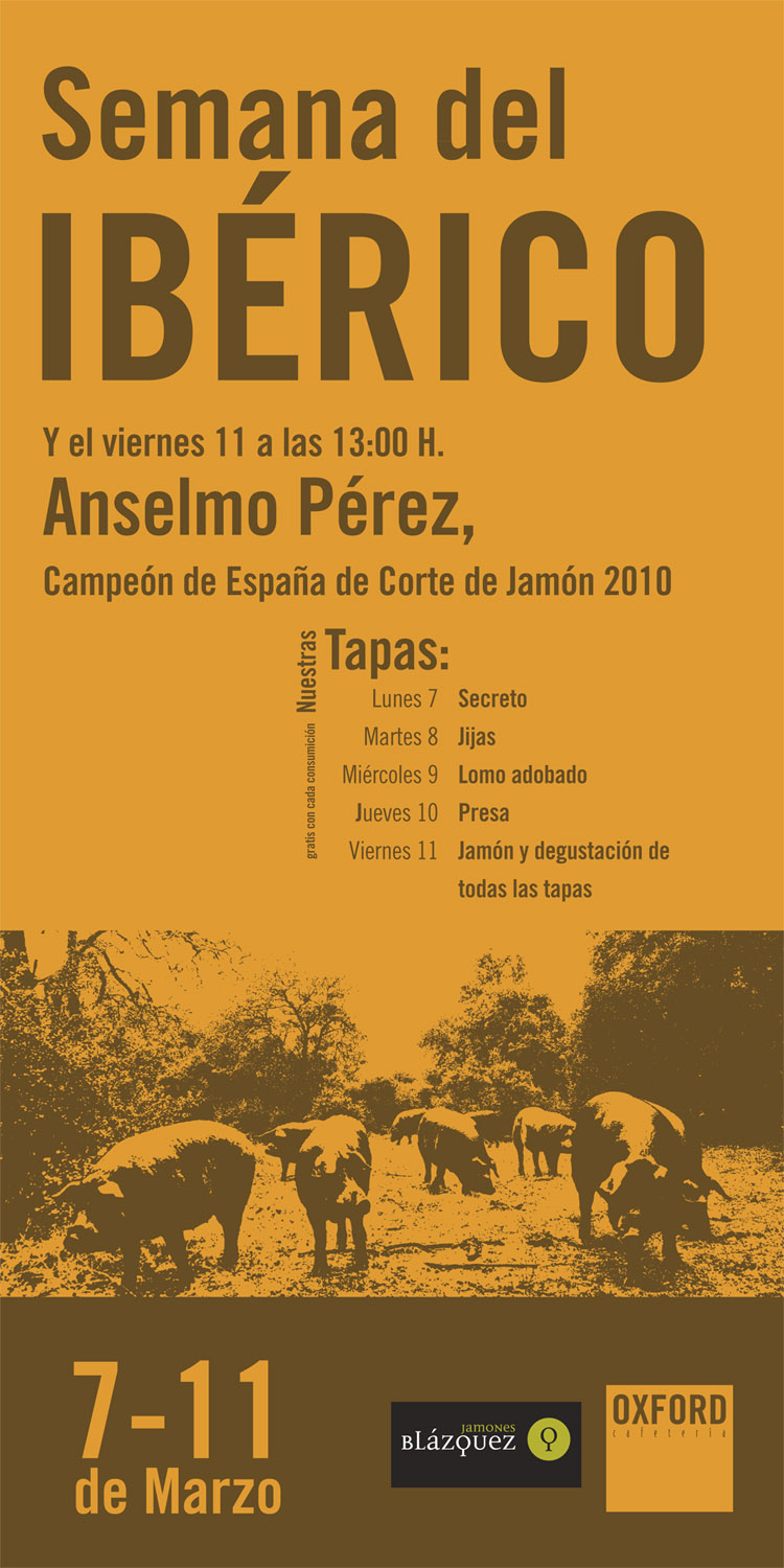 Una forma de rendir homenaje a una joya de nuestra gastronomía como es el cerdo ibérico, del que nos gustan hasta los andares. Cada día, a la hora del vermut y con cada consumición, pondremos una tapa gentileza de la casa, y finalizaremos el viernes con la presencia del Anselmo Pérez, campeón de España de corte de jamón, que nos dejará boquiabiertos con su manejo del cuchillo.